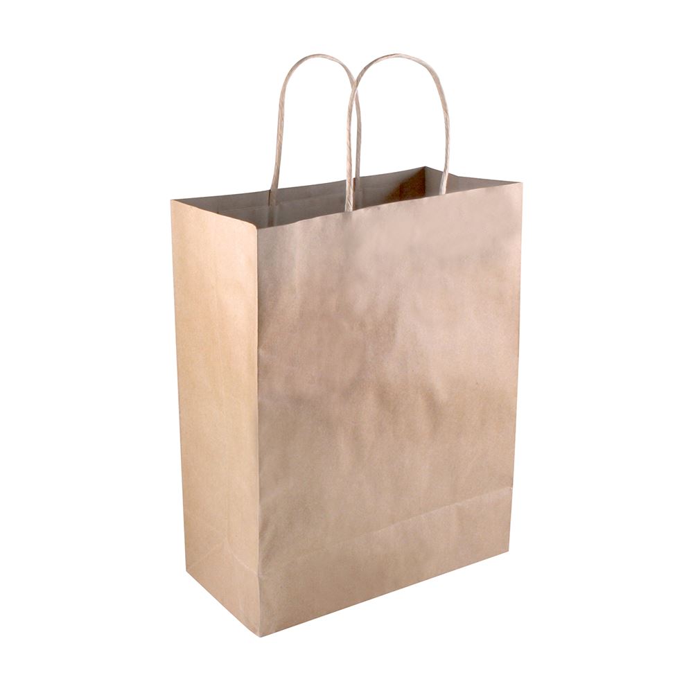 Premium-quality kraft shopping bag with twisted paper handles features a durable, reusable design that has a minimal effect on the environment. This environmentally friendly paper bags can be used multiple times and can be recycled. Reinforced gusset provides extra support while you shop, ensuring that your items will stay safe and secure no matter where you carry them.