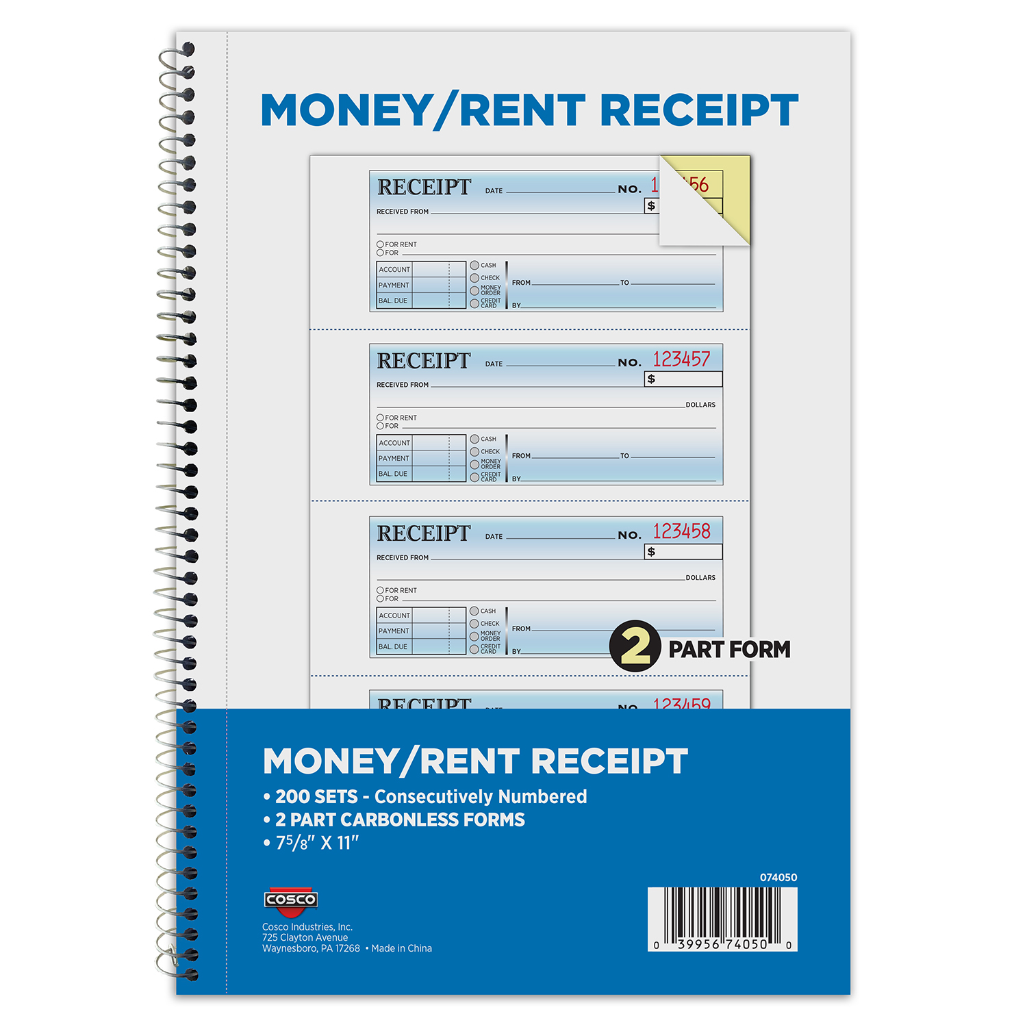 The COSCO Business Forms 2-Part Carbonless Money/Rent Receipt Book provides dependable payment documentation with an instant duplicate copy for every transaction, no carbon paper required. Each receipt is consecutively numbered to help streamline tracking and simplify financial record management. With 200 preprinted receipt sets per spiral-bound book, it is well suited for landlords, property managers, and businesses handling regular payments. The larger 7.25" x 11" format offers additional writing space for detailed payer information, amounts, and payment methods, while the professional layout supports organized and efficient bookkeeping.
