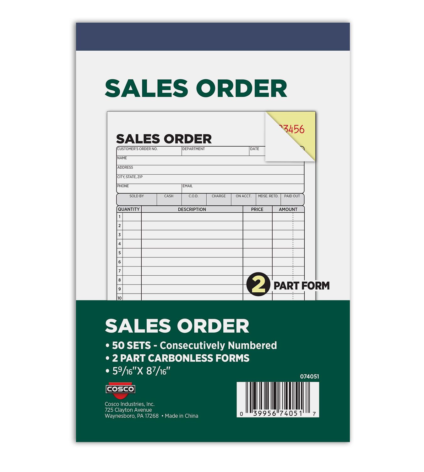 The COSCO Business Forms 2-Part Carbonless Sales Order Book helps businesses maintain accurate transaction records with a clean duplicate copy for every sale, no carbon paper required. Each book includes 50 preprinted sales order sets featuring clearly labeled sections for customer details, product descriptions, quantities, pricing, and totals. The compact 5.5625" x 8.4375" format is convenient for retail counters, service calls, and on-the-go use, while the professional layout ensures organized and dependable documentation for everyday business operations.