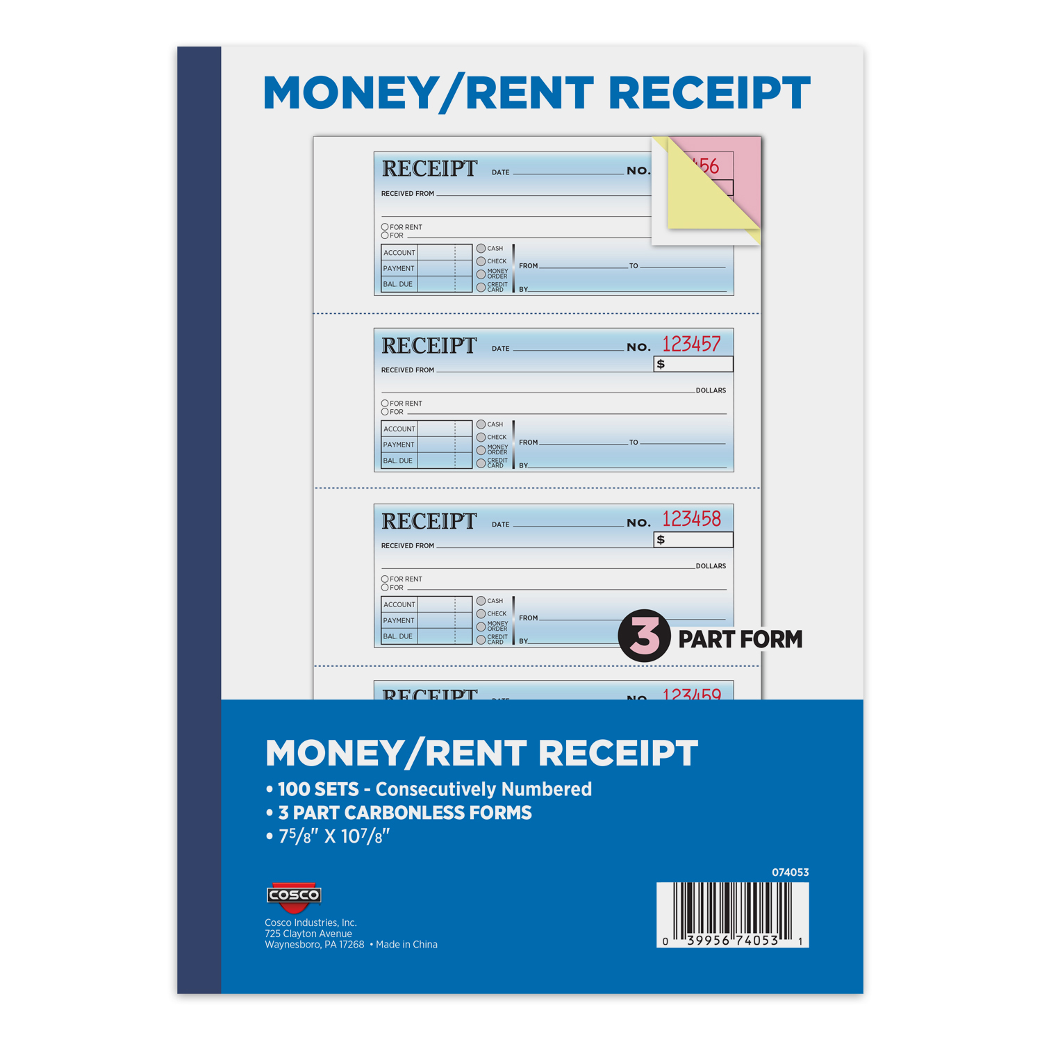 The COSCO Business Forms 3-Part Carbonless Money/Rent Receipt Book provides comprehensive payment documentation with two duplicate copies for every transaction, no carbon paper required. Each receipt is consecutively numbered to streamline tracking and improve financial record management. With 100 preprinted receipt sets per book, it is well suited for landlords, property managers, and businesses that require multiple copies for tenants, customers, and internal records. The large 7.625" x 10.875" format offers generous writing space for detailed payer information, amounts, and payment methods, supporting organized and professional bookkeeping.