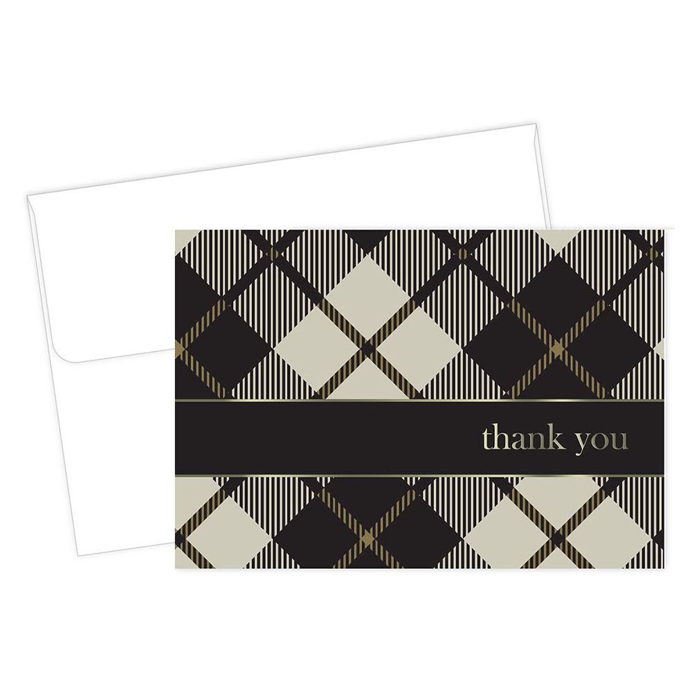 Express your gratitude with these black Plaid and gold foil accent thank you note cards. Pack contains 24 note cards and 24 white envelopes.