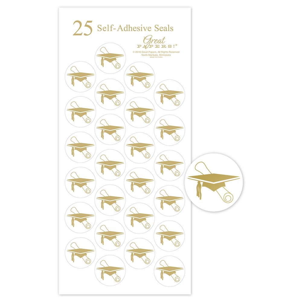 Great Papers! round self-adhesive graduation themed seals add a perfect extra touch on your announcements, invitations and stationery. Pack contains 25 clear self-adhesive seals with gold foil grad hat and diploma.