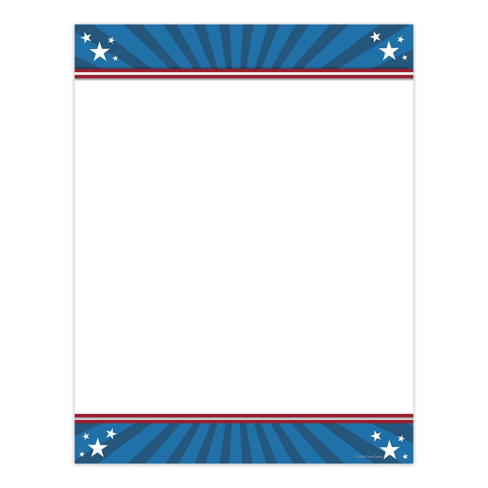 Great Papers! stars and stripes themed letterhead is the perfect way to communicate your special event, sale or announcement. This trending design will offer the patriotic spirit to all who receive it. This letterhead offers a stars and stripes design that makes it ideal for all your patriotic events! Each stars and stripes designer pack includes 80 sheets of printed 8.5"x11" paper on 65 lb. text.