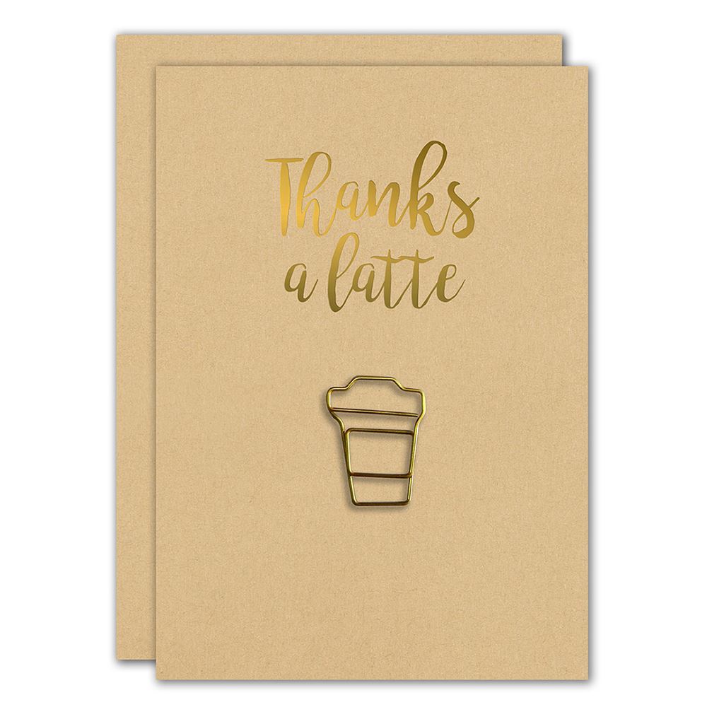 Tell them thank you with the NEW Great Papers! Kraft Thanks A Latte Paper Clip Encouragement Greeting Cards. This card is designed to show your gratitude in a larger way. Each card offers a Gold latte shaped paper clip which makes it perfect for attaching gift cards! Inside is blank for your own personal, handwritten message. Kraft envelopes are also included.